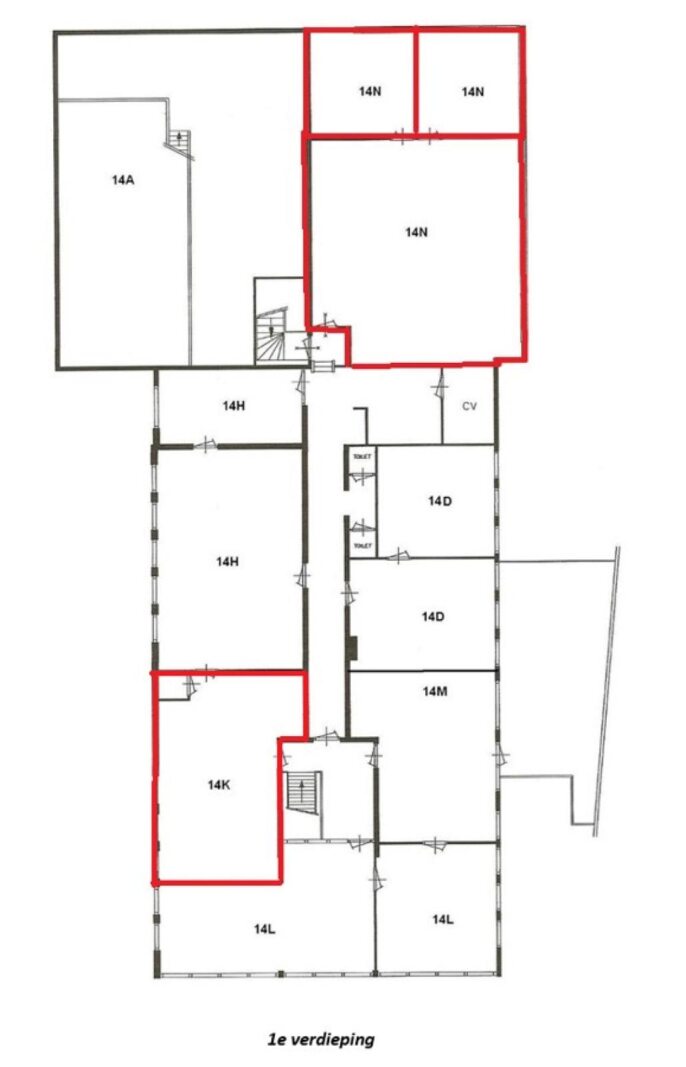 * de oppervlakte van de kantoorruimte is inclusief toerekening van de algemene ruimten (entree, gangen, toiletten, etc.): + ca. 21%